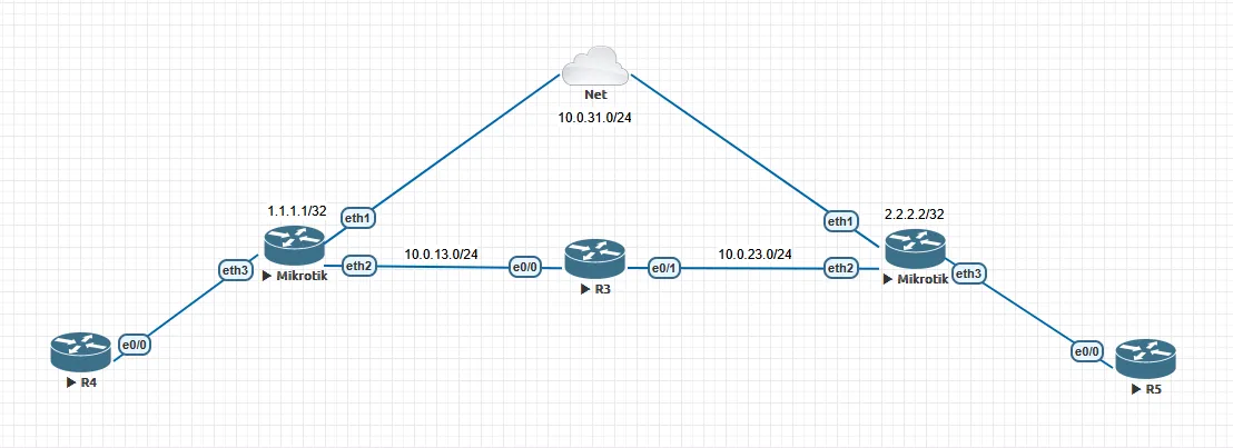 /interface bridge add fast-forward=no name=Lo0 protocol-mode=none /ip address add address=10.0.31.140/24 interface=ether1 network=10.0.31.0 add address=10.0.23.2/24 interface=ether2 network=10.0.23.0 add address=2.2.2.2 interface=Lo0 network=2.2.2.2 OSPF: /routing ospf instance add disabled=no name=ospf-instance-1 router-id=2.2.2.2 /routing ospf area add disabled=no instance=ospf-instance-1 name=ospf-area-1 /routing ospf interface-template add area=ospf-area-1 disabled=no interfaces=ether2,Lo0 use-bfd=yes BGP: /routing bgp instance add as=63689/63689 disabled=no name=vxlan /routing bgp template add afi=evpn as=0 disabled=no multihop=yes name=vxlan nexthop-choice=force-self /routing bgp connection add afi=evpn as=63689 disabled=no input.accept-nlri=input instance=vxlan local.role=ibgp multihop=yes name=bgp1 nexthop-choice=force-self output.network=output \\ .redistribute=connected remote.address=1.1.1.1/32 .as=63689 routing-table=main templates=vxlan /routing bgp evpn add disabled=no export.route-targets=1010:1010 import.route-targets=1010:1010 instance=vxlan name=bgp-evpn-1 vni=1010 /interface bridge add fast-forward=no name=bridge-vxlan protocol-mode=none pvid=10 vlan-filtering=yes /interface bridge port add bridge=bridge-vxlan interface=ether3 pvid=10 /ip address add address=192.168.1.253/24 interface=bridge-vxlan network=192.168.1.0 /interface vxlan add bridge=bridge-vxlan bridge-pvid=10 dont-fragment=disabled hw=no learning=no local-address=2.2.2.2 mac-address=00:00:00:00:00:02 name=vxlan1 vni=1010 /ip route add dst-address=0.0.0.0/0 gateway=10.0.31.254 add disabled=no distance=111 dst-address=1.1.1.1/32 gateway=10.0.31.139 routing-table=main scope=20 suppress-hw-offload=no target-scope=10